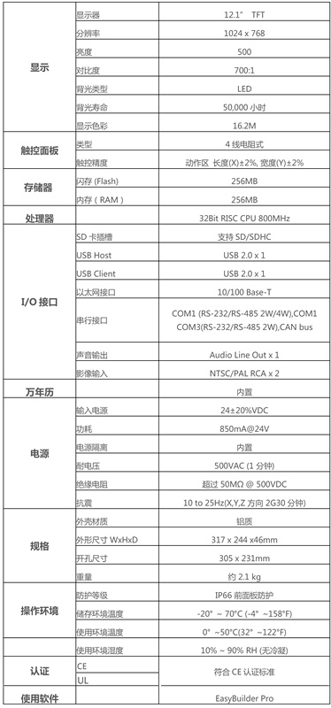 產(chǎn)品特點(diǎn) Installation 鋁合金外殼搭配全新色彩與時(shí)尚設計 Video Input Ports 支持 NTSC 及 PAL 格式 12.1" 1024x768 TFT 工業(yè)級 LCD 無(wú)風(fēng)扇冷卻系統 內置 256MB 儲存內存及萬(wàn)年歷 NEMA4/IP66 面板防護等級 陶瓷封裝高壽命LED背光 SD 卡插槽支持 SD/SDHC 內置電源隔離防護器 Com1或Com3 RS485 2W 支持 MPI 187.5K CAN bus 裝置支持 CANopen 通訊協(xié)議 Com1 / Com3 RS485 及CAN bus 隔離器內置